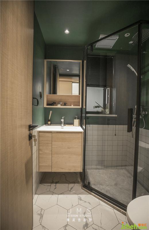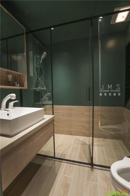 卫浴空间的设计更加重视色彩的运用,木色地板的使用让空间充满了暖意,墨绿色的墙体和天花,在玻璃隔断的映衬下让人仿佛徜徉在广阔的森林里,空间感与自然感展露无遗。