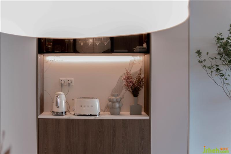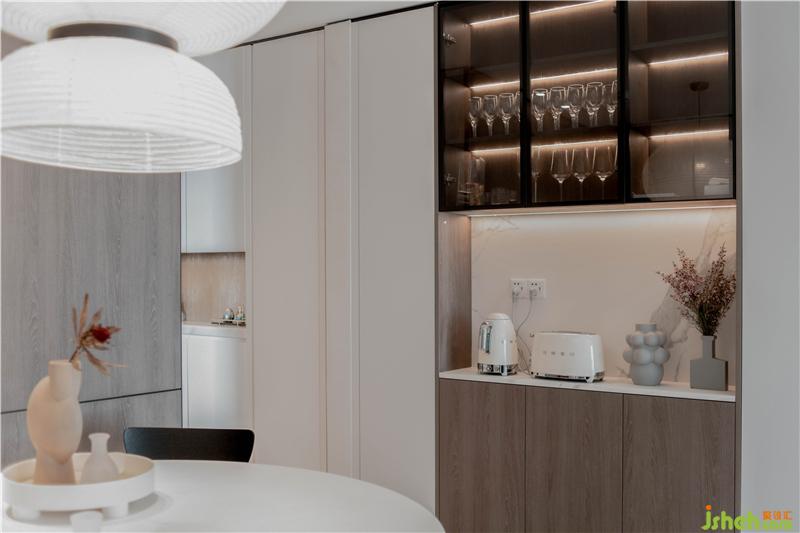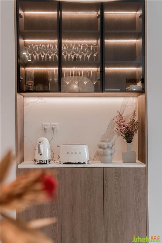 柜体配以同色木饰面板,将玄关和客厅区域巧妙地区分开。餐边柜的吊柜采用玻璃层板,加入灯带营造温馨的氛围,更添高级感。