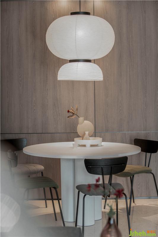 餐厅的灯笼状的主灯和墨绿色的餐桌,成为整个空间最吸睛的部分,艺术感十足,与极简风造型的餐桌椅相搭配,形成视觉上的平衡。