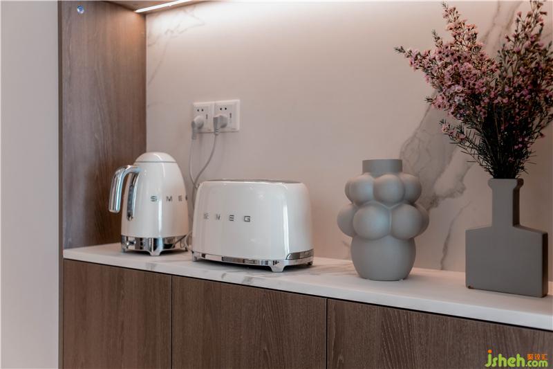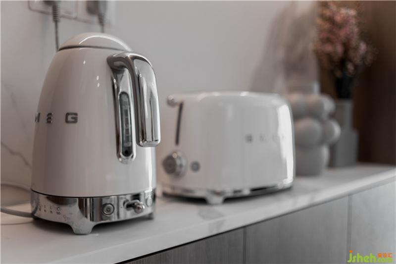 餐厅中间的墙面镂空作为操作台,放着顾佳同款面包机、热水壶,方便实用。