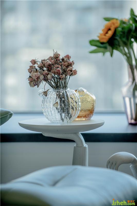 各色鲜艳摆件的碰撞,给人以强烈的视觉刺激,调动了空间的活跃性,让整体冷调的客厅变得鲜活温馨起来,呈现出凌乱的美感。