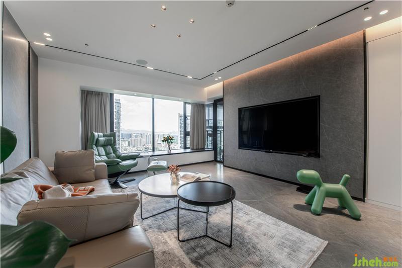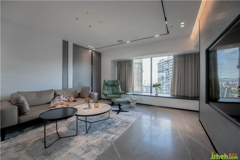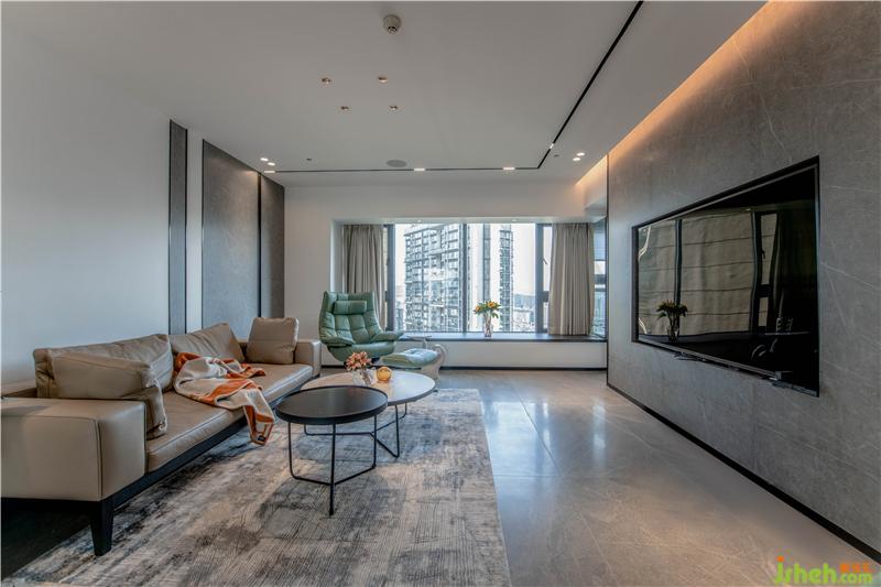 在此次案例中,通透开阔的大平层配合偏冷的主色调,显得高级而有质感。没有过多装饰和色彩搭配的设计描绘出极简主义风格,让整个空间看起来利落又不失大气。全房无主灯设计,光源沿着轨道灯延伸至空间的各个角落,展现精致生活。