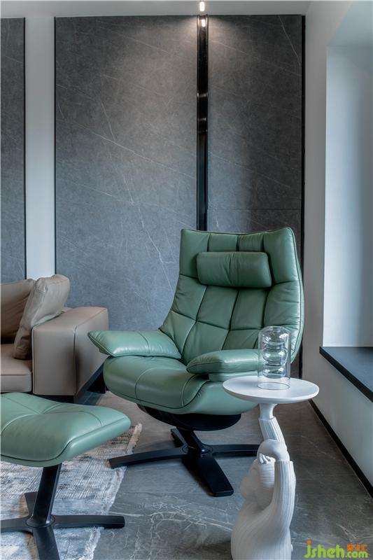 此次案例最大的特点之一便是在客厅增加半开放式书房的设计,推拉门可常开,最大限度地保证了读书工作的安静和空间通透的需求,颠覆了传统意义的客厅设计,既满足了男主人阅读、打游戏的兴趣爱好,又提升了空间的整体品味格调。