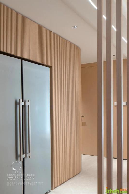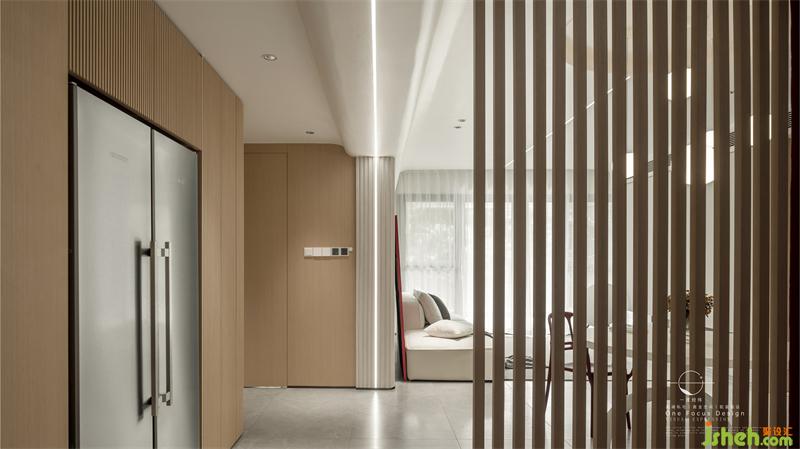 从玄关进入客厅空间,整体木制柜体与格栅透露出自然柔和的感觉。把原先的储物间规划入客厅,让公共区域更加宽广,整个室内都充满了阳光气息。