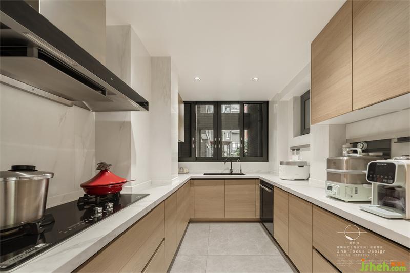玄关一侧就是厨房空间,厨房整体墙面以白色为基础,搭配木质橱柜与洁白的操作台面,简约的空间让烹饪的氛围更加轻松简单。