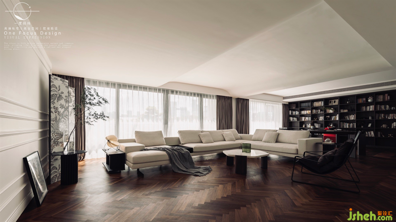 在高挑的客厅中,设计师以宽阔的视野将室外阳台的自然光线,苍翠欲滴的树影隐隐若若地引入空间内,与精心布置的陈设形成艺术对话。深浅温润的木地板在光线的照耀下充盈着自由的气息与生活的温度。