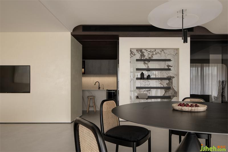 Sitting room, dining room and teahouse are semi-open and set adjacently,which provides a relatively pure communication space for the hosts and guests. Thekitchen, corridor, housekeeper's room and terrace are connected to each otherto facilitate the housekeeper's daily work and enjoy the garden scenery of the hosts’terrace. The sofa TV set in the elder room is convenient for the elder to restand kill time.