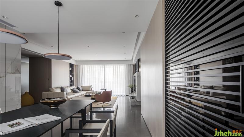 餐厅作为厨房与客厅的链接,在色调和材料的使用上,保持了空间的连贯性,同时,吊灯与地面恰到好处的相呼应,变化中不失统一。