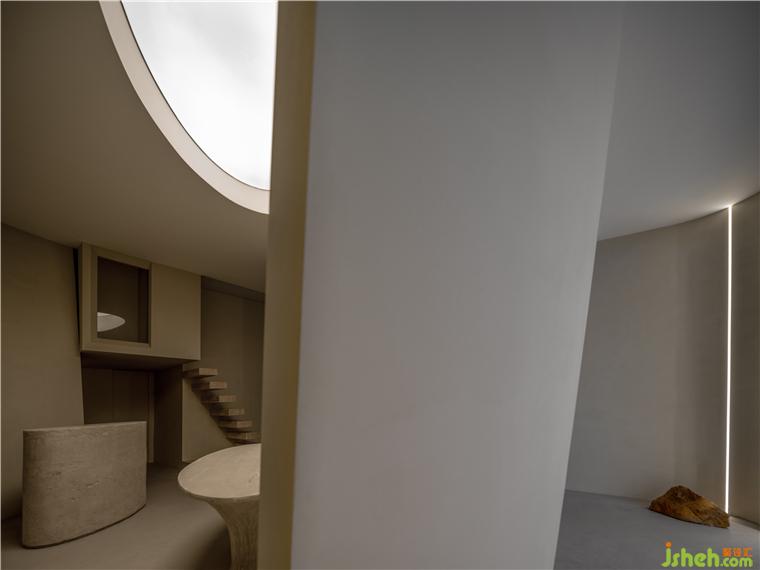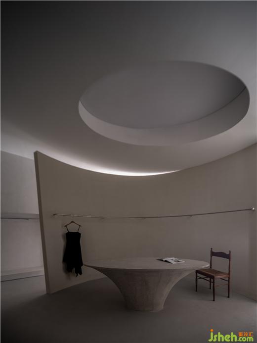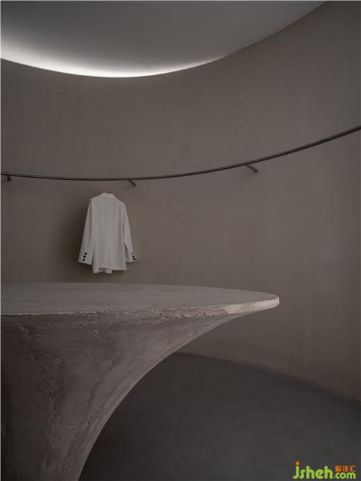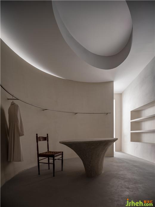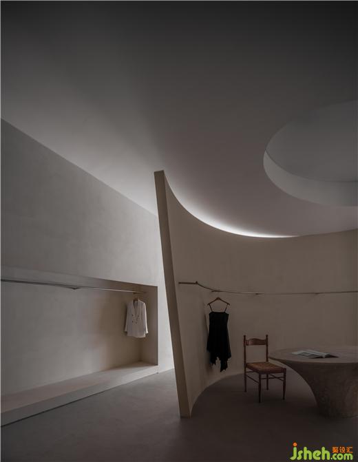 YIMENZI衣门子厂牌体验店,在经营属性上兼具线下临街半开放式橱窗功能和线上产品直播间功能。因此,体验店设计师以一大、一小两段弧形墙体和云步七阶将原本“一眼看完”的空间横向分为五个功能:入口模特及装置展示、产品陈列、产品直播、试衣间及洗手间等功能区域;纵向衍生出储藏备货空间,云步阶梯也是YIMENZI着装出片的不二之选。是功能俱全的半开放橱窗,亦是日常经营和夜间直播两用的体验空间。