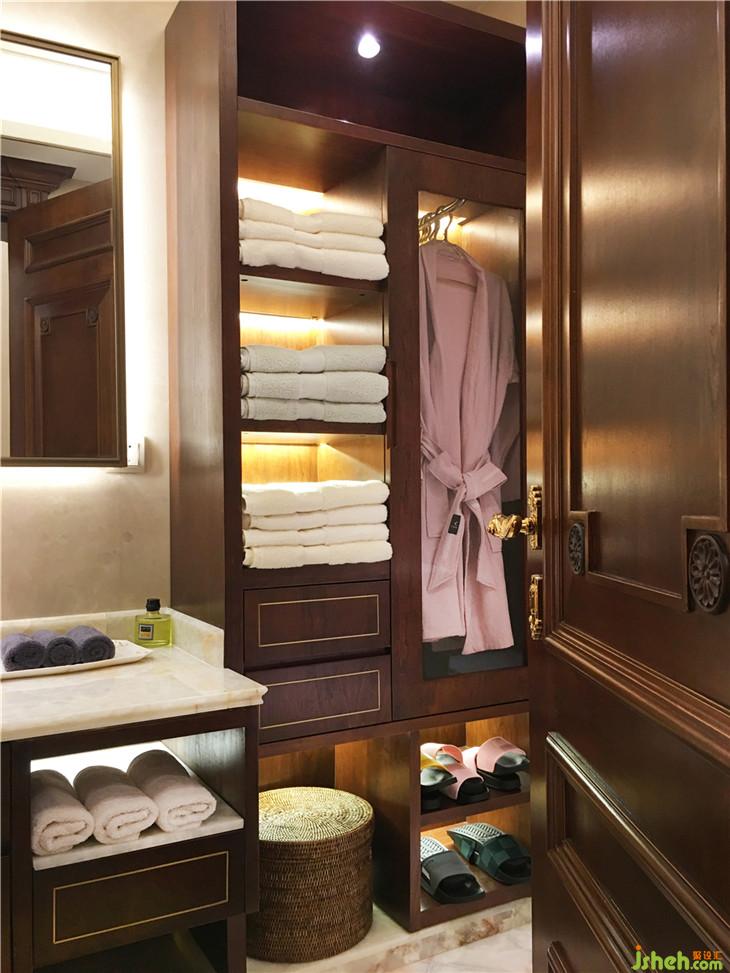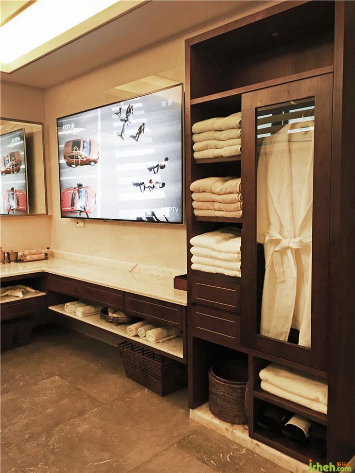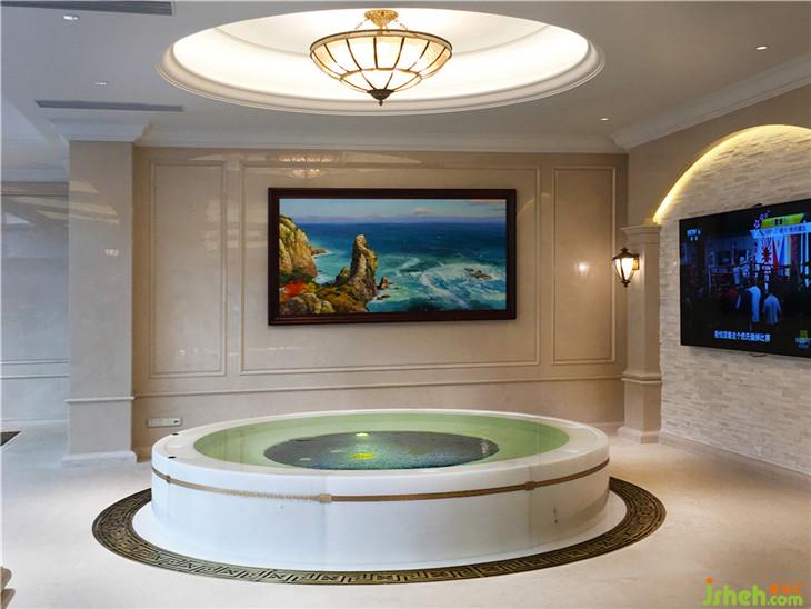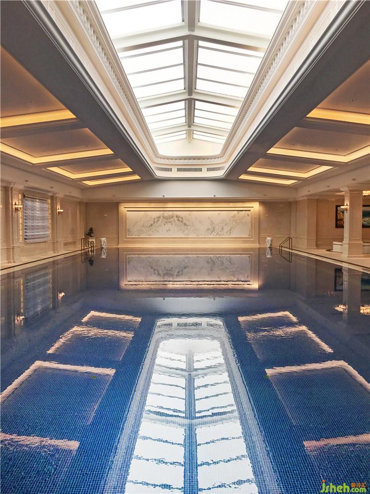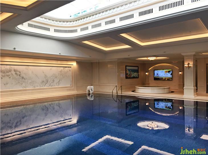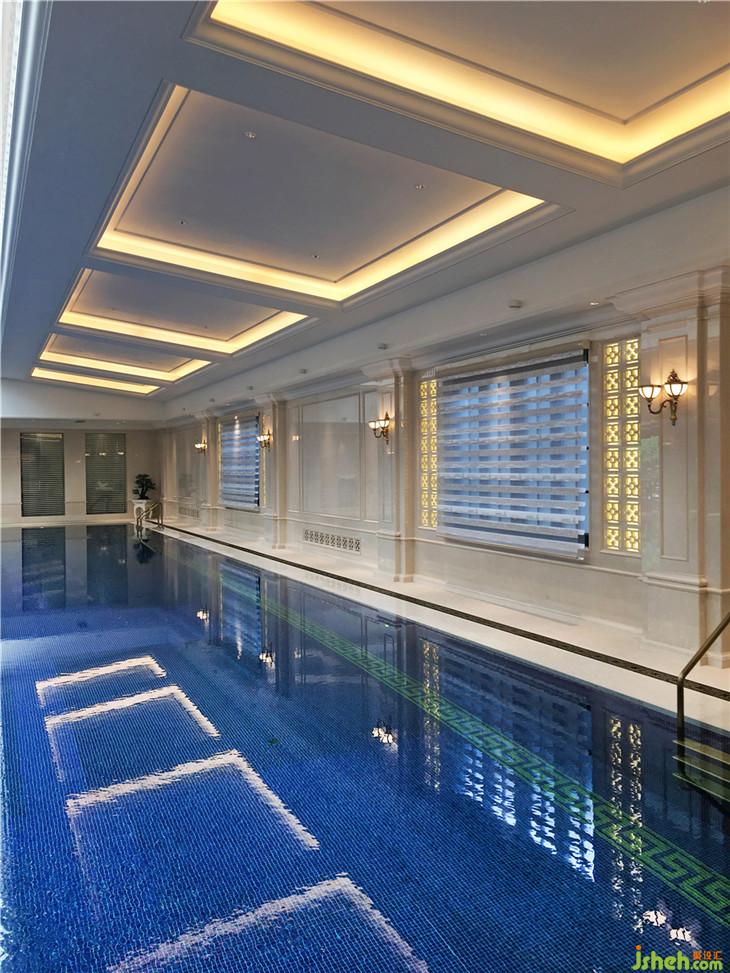 专业的灯光设计,更增添了空间品质也层次感。自动伸缩采光天井,使空间有日夜变化,藏蓝色的马赛克与24K金箔马赛克点亮整个水面,波光粼粼更有灵气。卫生间与黄桶房色调与灯光考虑完美的使用功能。天花吊灯选用美式古典风格,高雅尊贵。