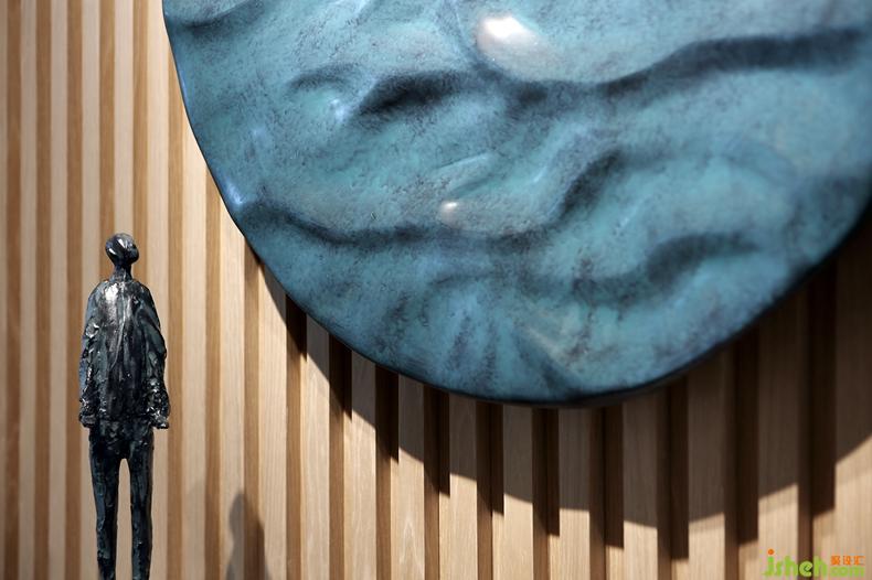 初入空间,映入眼帘的是一组名为“观海”的艺术品,从案台上铜人雕塑角度看过去,挂画在灯光照射下“波光粼粼”。