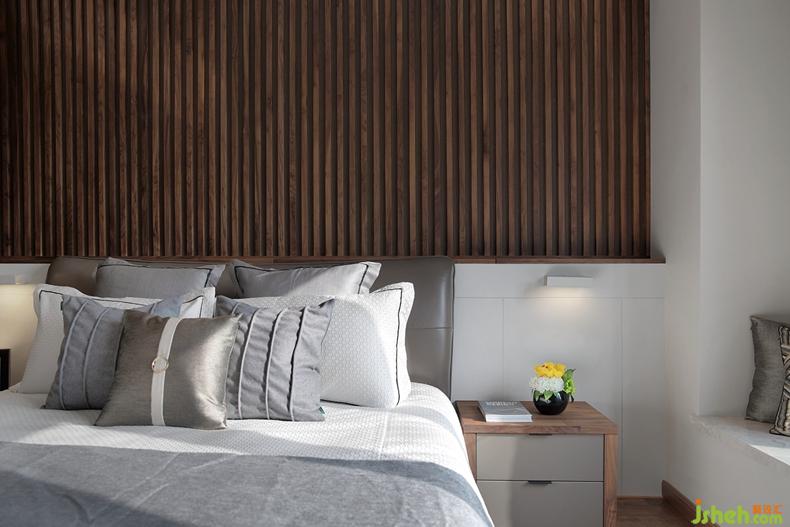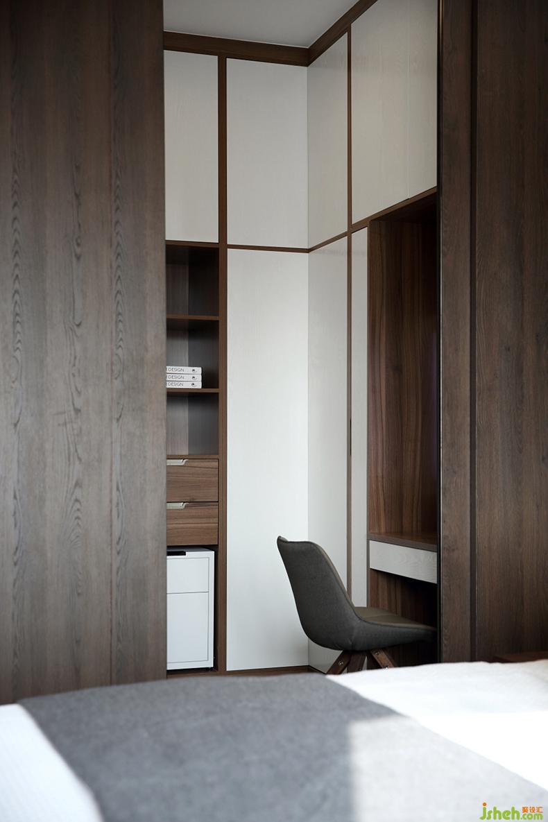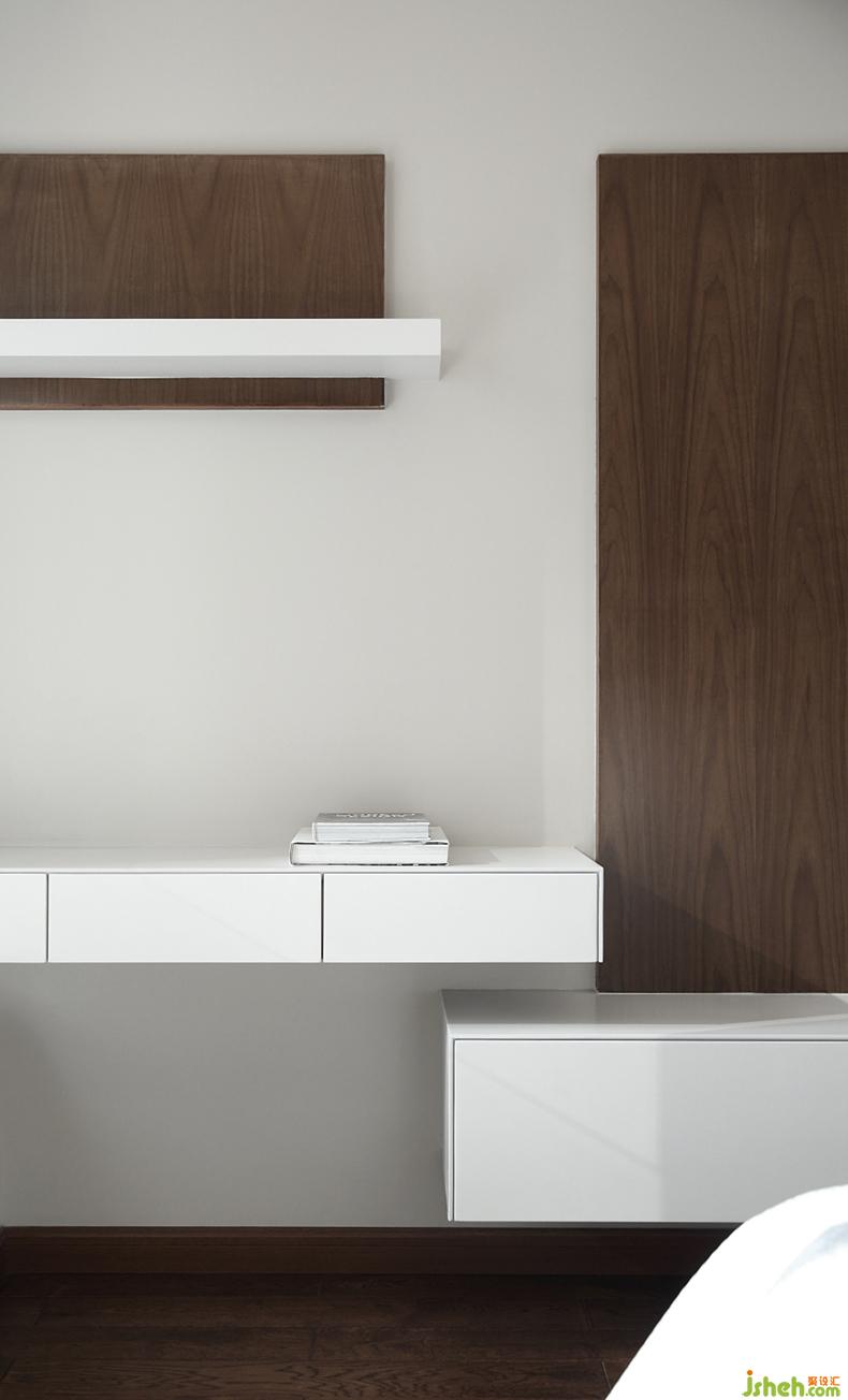 主卧是最惬意闲适的地方,以稳重雅致的胡桃木色作为房间的主色调,与白色家具的交错更像是一幅几何形块的画作,透过黑白关系,褪去张扬,优雅而至。