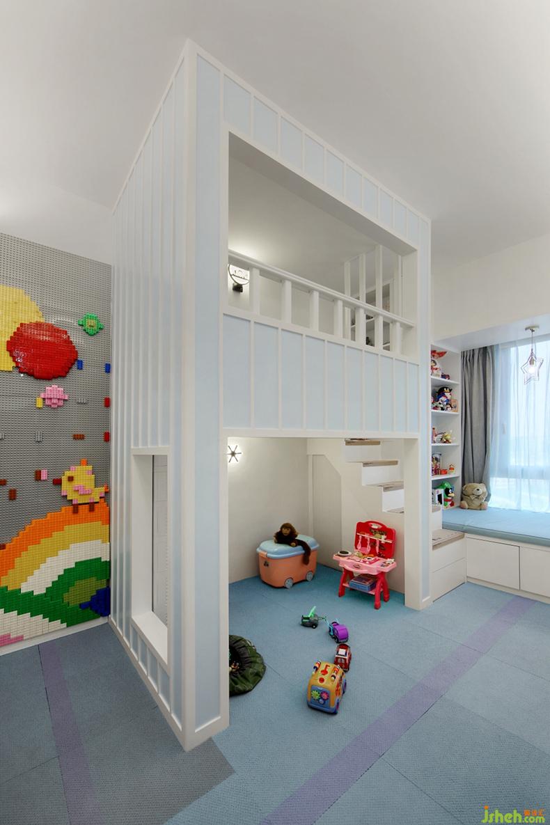 运用了小复式的结构,让儿童房呈现一个童趣盎然的奇妙世界,满足萌动童心。既有乐高墙,又有凸窗部分的阅读区,运用这些不同的功能区间,培养儿童的想象力和创造力,探索新世界。