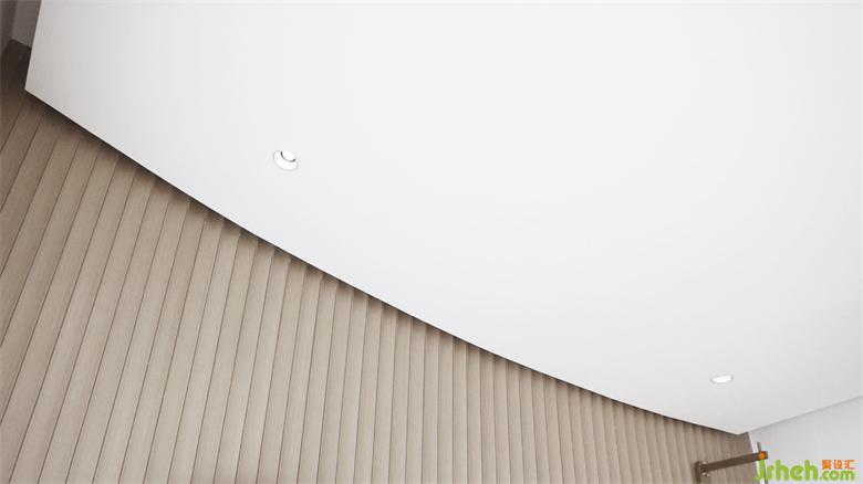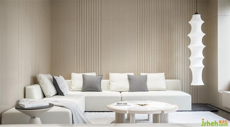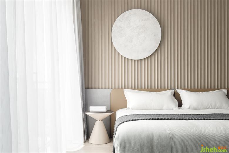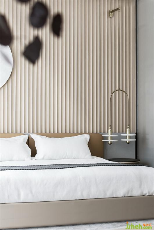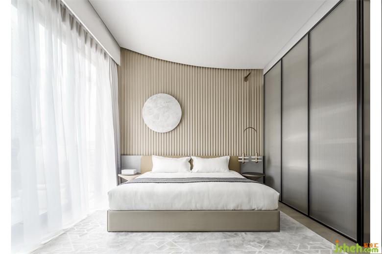 叠墅样板房设计师善于用光学技巧与几何学法则打造出带有自然、梦境与意念相糅合的空间场景。大面积的木饰面采用了弧形的设计,细节考究,加上四时不同光线的提炼,让空间界面浸润在阴影的交错与明暗之中,凸显出时间对于空间的意义。床头背景墙一轮灰色的月影,在光线充沛的白日,如同月之暗面一样安静的存在着。待到日暮时分缓缓亮起,为室内洒下安静皎洁的“月光”。