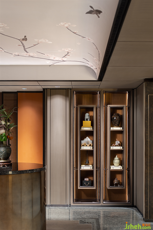 青绿,从《千里江山图》中走来,在画中静待千年,历经千年而未衰,即使在幽暗的环境中依然泛着宝石的光芒。别墅样板房设计一层的会客空间,色调沉静古朴,墙面的山水画卷大气磅礴,彰显着主人心有丘壑、眼存山河的胸怀与气度。而点缀其间的青绿是才是整个空间的灵魂,它才是生命力最强的,就像明月一样,存在千年。