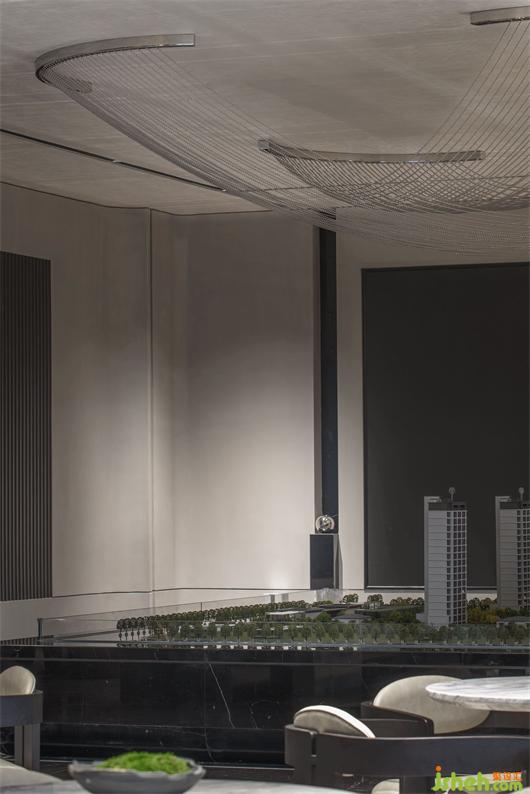 △图注: 沙盘上方的大型艺术装置以历史悠久的诸暨传统编织工艺为灵感,售楼处设计将现代的材料和古老的技艺融合,致敬古老而绚丽多彩的诸暨文化。