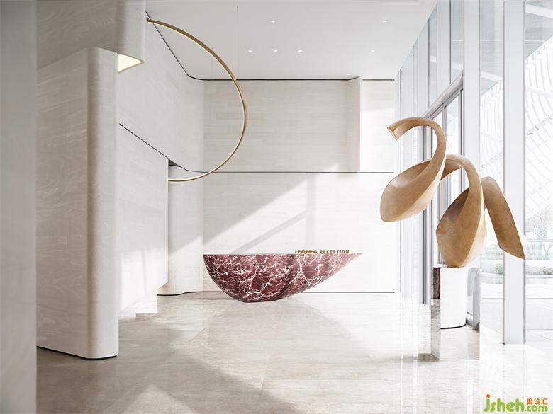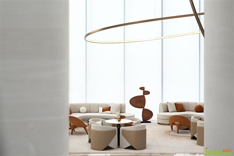 整个空间摒弃掉传统的大型隆重的装饰吊灯,用装置艺术的手法去考虑室内灯饰的布陈,大量简洁干练的弧形环形的艺术灯饰穿插其中,犹若星辰运行的轨迹。
