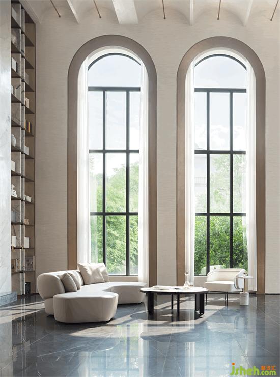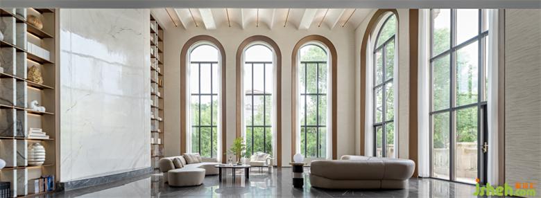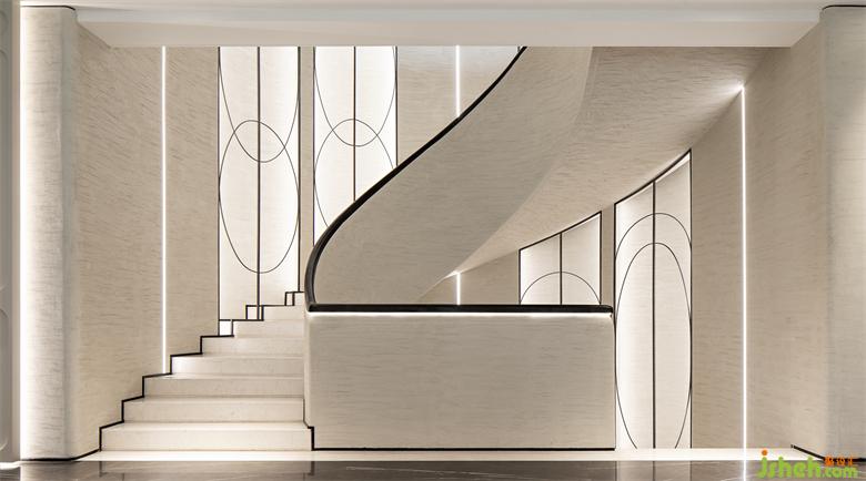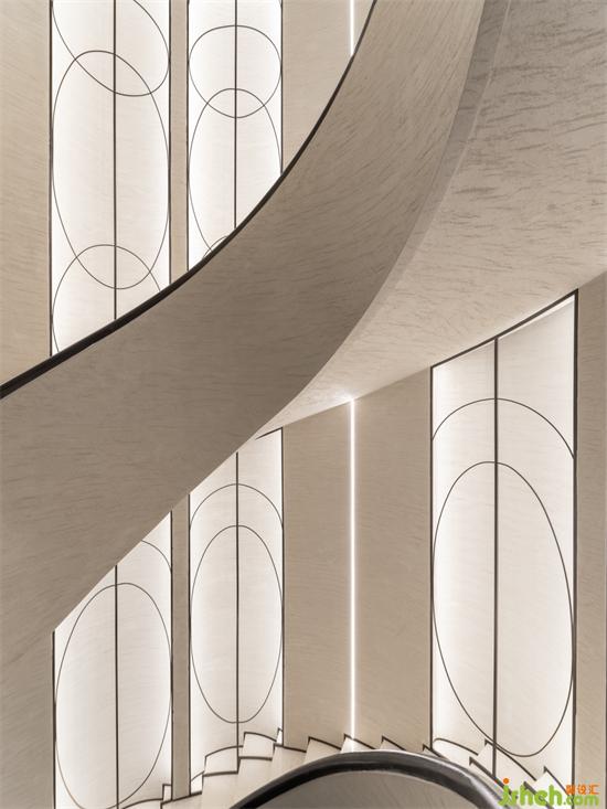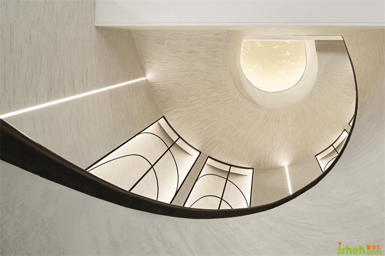 △ 设计师将弧形旋转楼梯的两个转角多余的空间利用起来,利用镂空造型的进深感和灯光氛围的营造,使得贯通整个小院主建筑的旋转楼梯具有剧场版的梦幻感和仪式感。