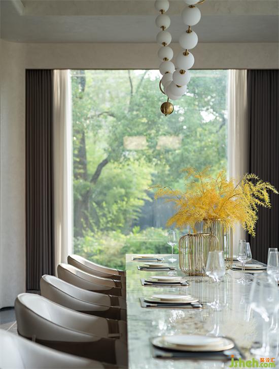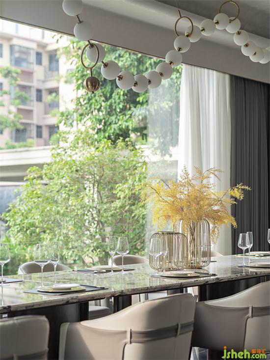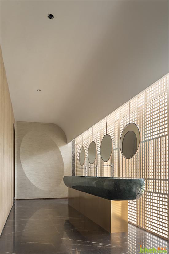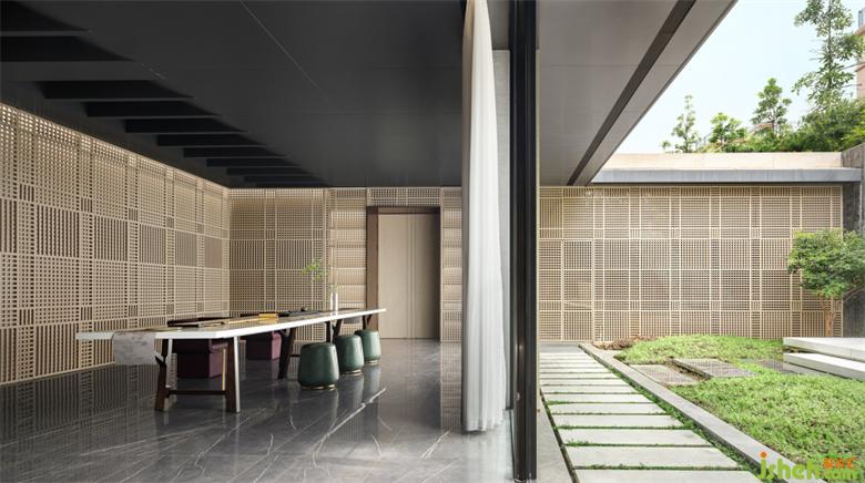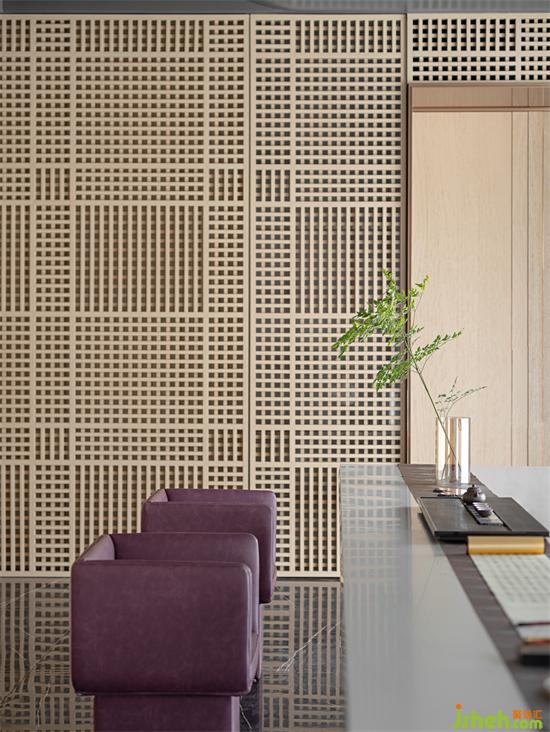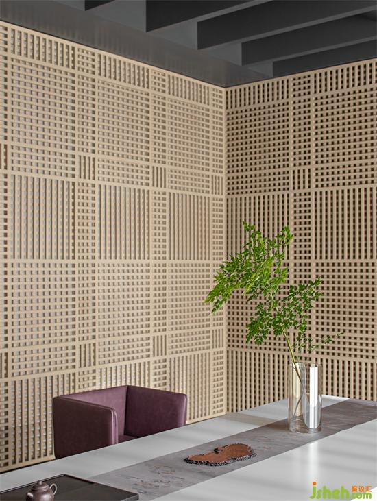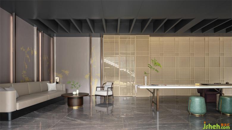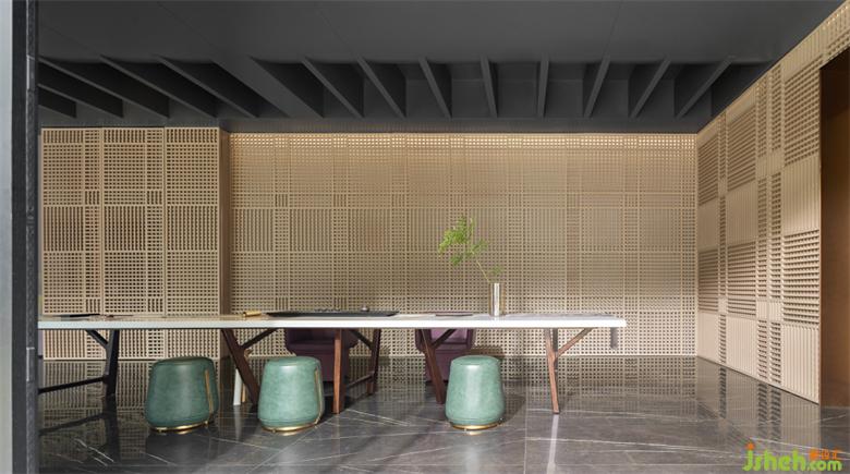 在这里,设计师使用了更加内敛深沉的色彩, 天花也没有了外放的弧度。横平竖直,是空间的风骨和胸襟;隔栅错落,将疏朗通透,兼蓄秀茂带入其中。
