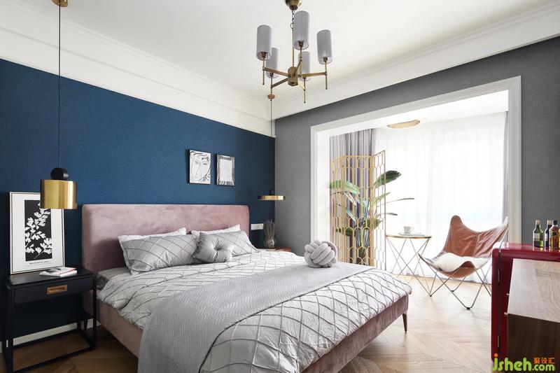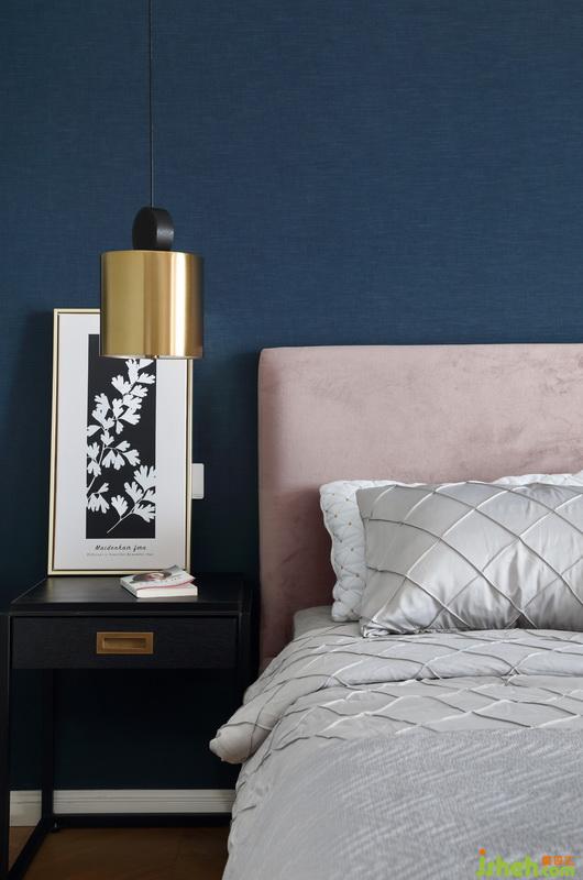 灰粉色和墨蓝色搭配出适合休憩的空间,同时又不失时尚感。
