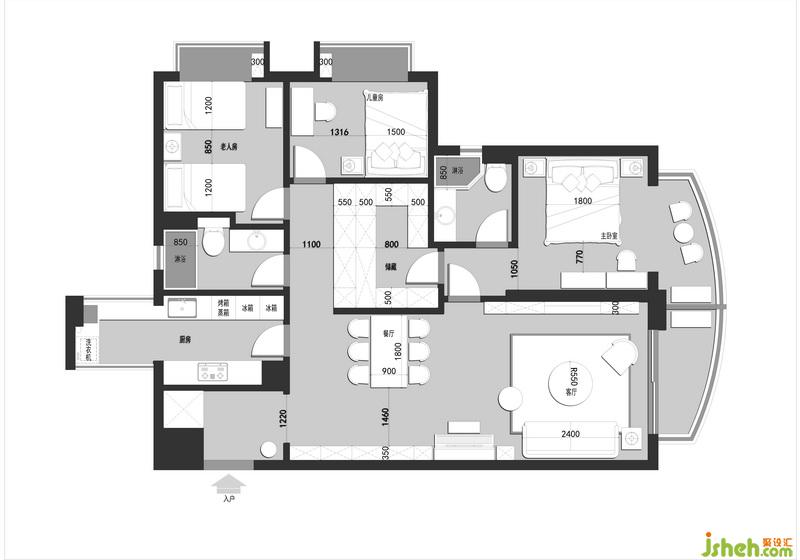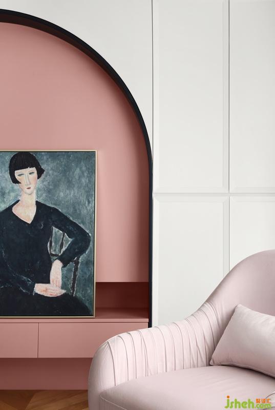 餐厅以黑白灰为主要色调,然后用粉色的餐椅和黄色的装饰画来柔化空间的质感,增添餐厅空间的活泼度。餐边柜同时也兼具个性和美感,还呼应了电视柜的弧形元素。