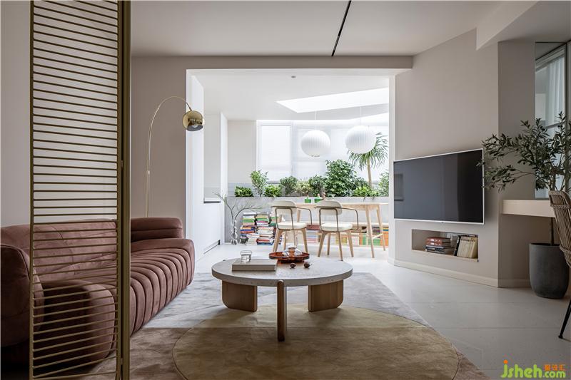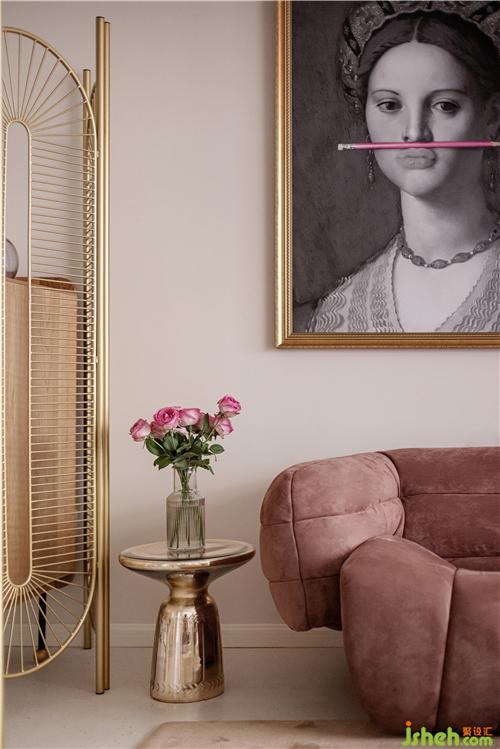 墙顶面使用非常浅的咖色包裹,使用同色系棕色沙发压住画面,地面采用同色系哑光地砖铺设,搭配黄铜屏风与金色落地灯,空间使用复古元素连续穿插,整体使用大地色系制造温柔。室内设计师