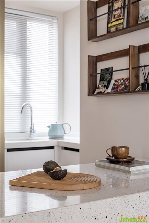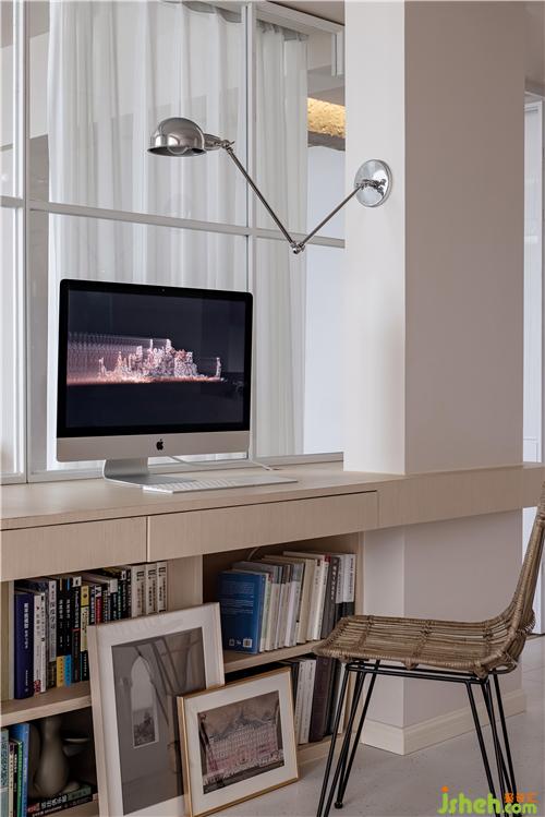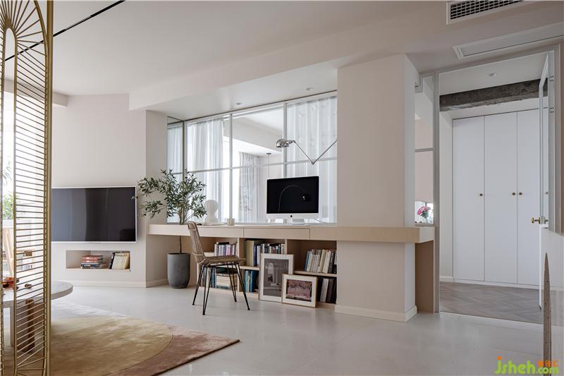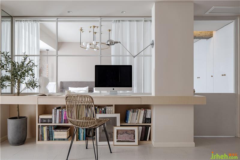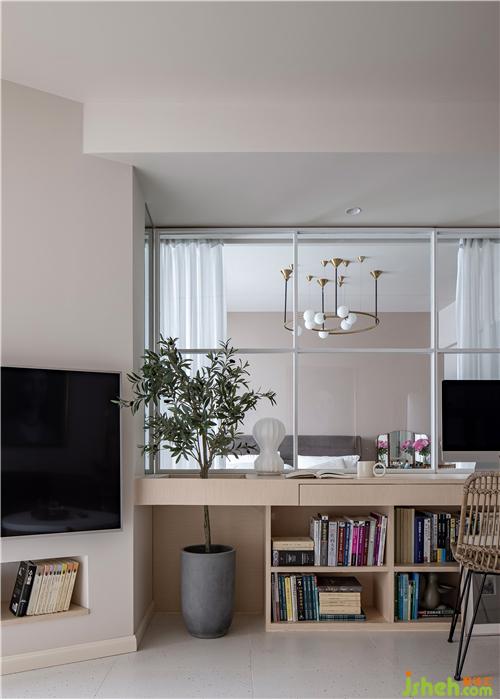 在客厅现场制作可供两人使用的办公写字台,下方用书柜支撑,写字台也起到划分客厅与卧室的功能,弱化电视背景,整体为业主量身打造。写字台下方书柜放置常用备课书籍,客厅与卧室之间仅用通透玻璃纱帘分隔。室内设计师