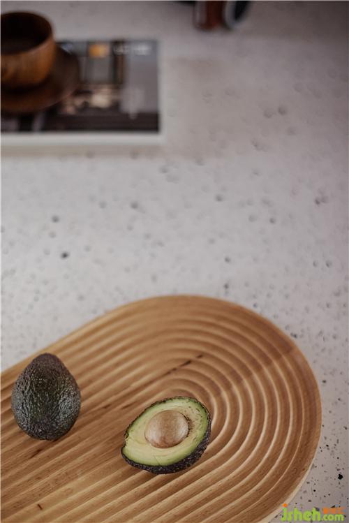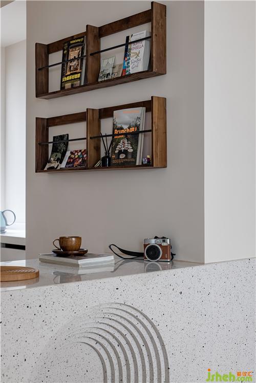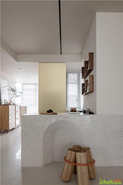 水吧台采用水磨石一体化造型台面及侧板,立面内凹多层拱形,满足美观同时亦可为矮凳提供放脚区域,矮凳可兼做换鞋凳,吧台背景使用金色铜板包墙和整个空间进行呼应。