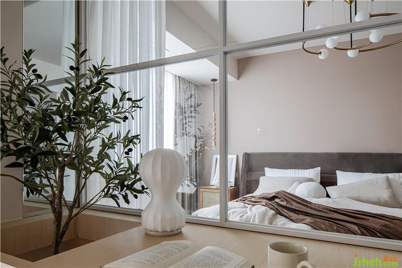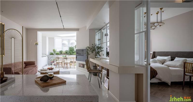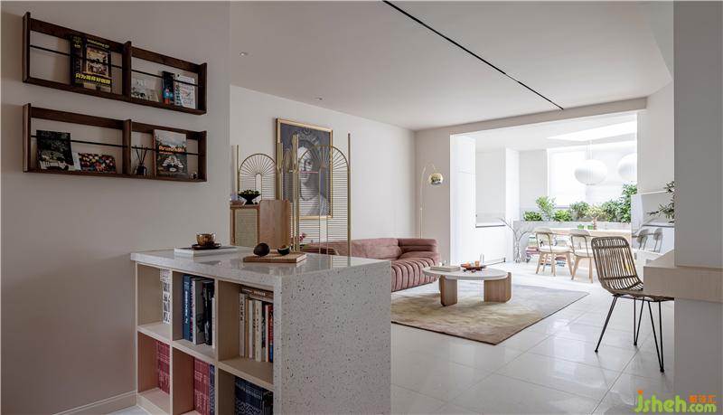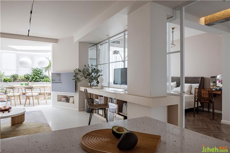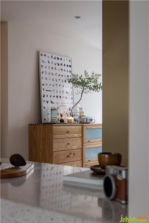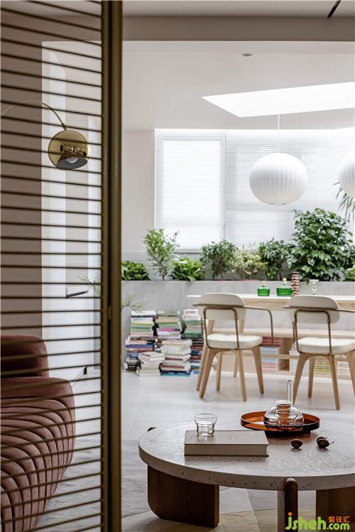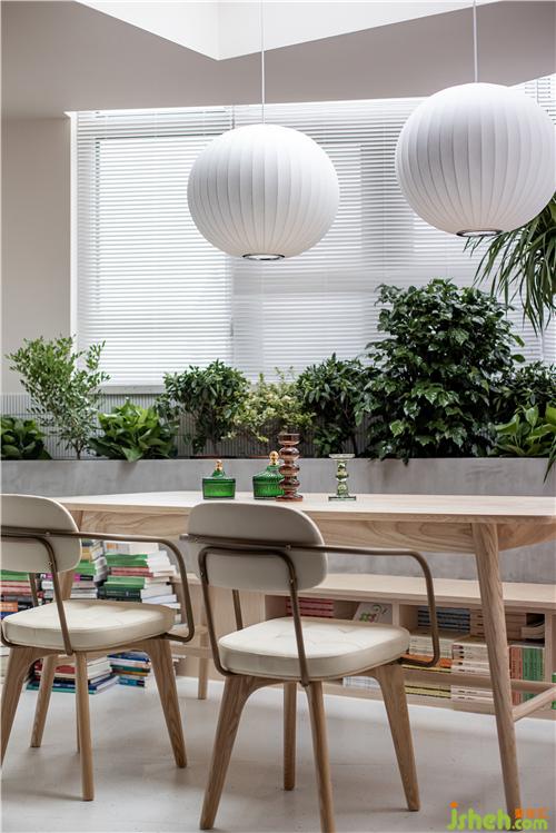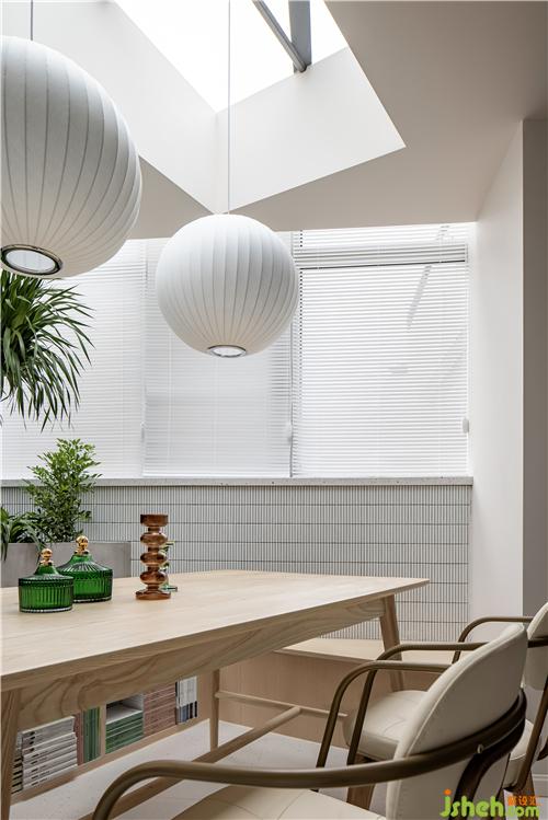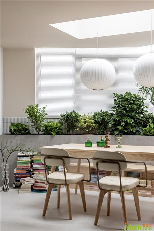 餐厅将户外阳台封闭,开设天窗,增加植物景观,下设木制卡座,集合书柜,搭配原木色餐桌与皮制餐椅进行混搭,整体色系将客厅空间与餐厅空间氛围融合过渡。 餐厅卡座同样选用原木色搭配,一反复古常态。