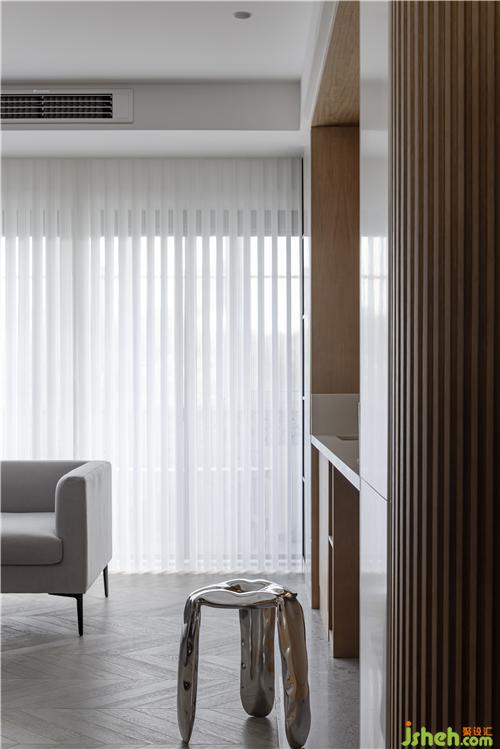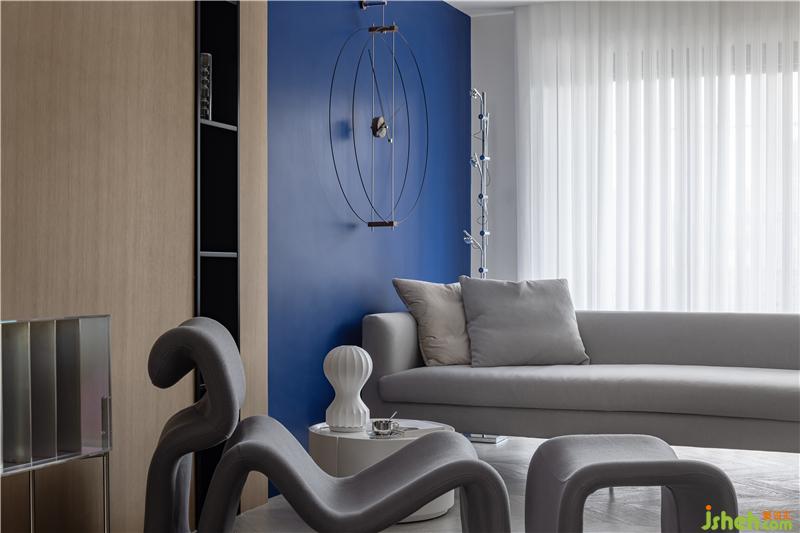 客厅横置沙发和单人躺椅形成互动,二三人或躺或坐,谈笑或观影,乐在其中。
