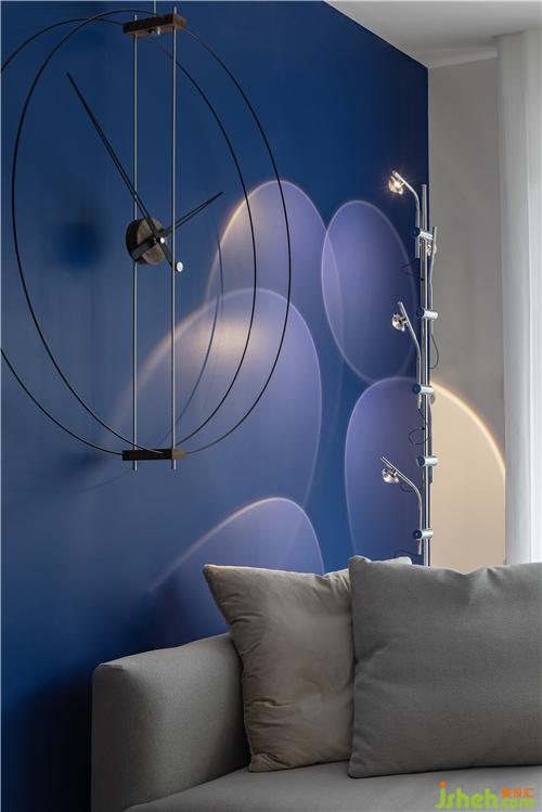 客厅沙发非常规布置,对面制作水吧台,内嵌式冰箱,单水槽以及入户鞋柜。业主平时很少看电视,只在水吧台上方暗藏了电动投影幕布。