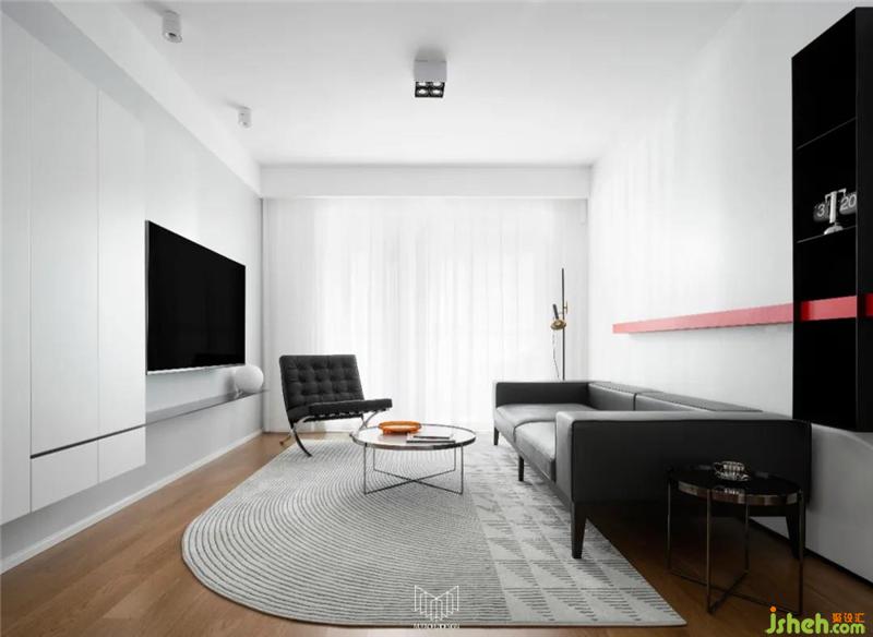 ● 增加电视墙柜体,定制简洁的钢板电视柜。