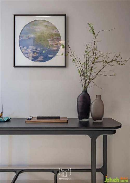 进门第一感受:苏绣勾勒的印象派睡莲和玄关桌上的藤蔓状绿植交相辉映。