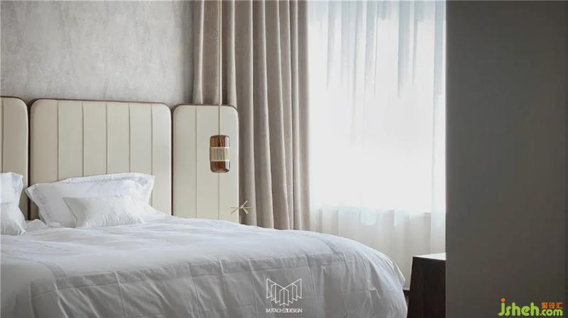 房间按照家庭成员的审美趣味设置了不同的主题。主卧选择了暖白色,米黄色和青灰色,搭配大量胡桃木和少许黄铜,营造了一种温润又刚毅的理想气质。