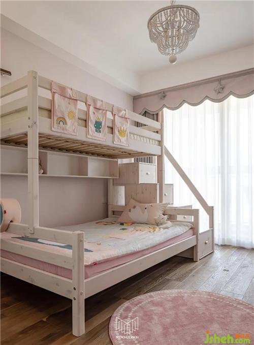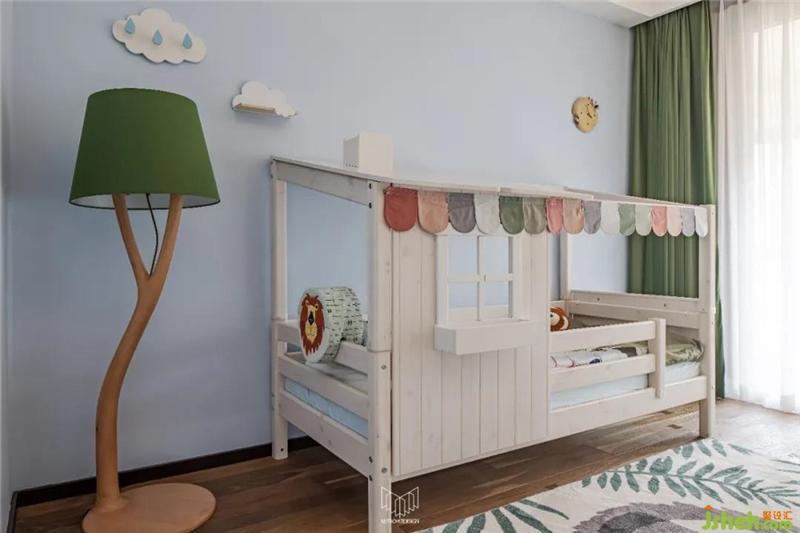 两个宝宝房间分别被布置成蓝色天空下的小丛林和粉甜的公主屋。