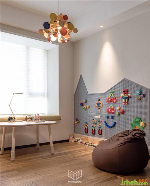 书房由明亮的三原色组成,乐高板,黑板墙,积木吊灯,豆丁懒人沙发,让人忘却大部分无意义的烦恼。