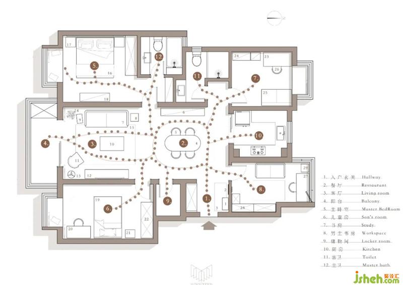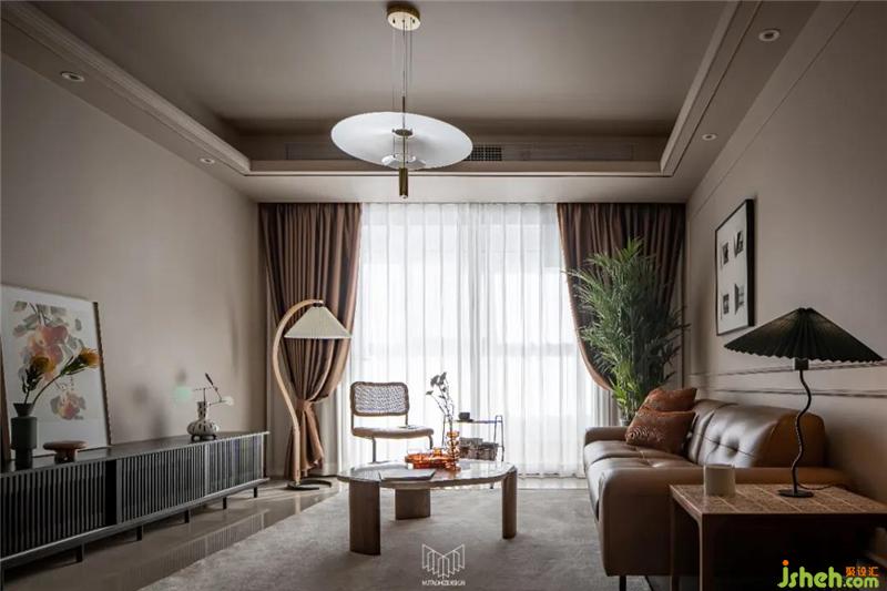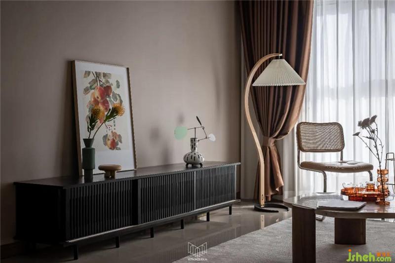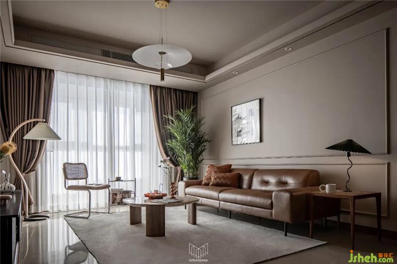 摩登复古质感的CAMPAIGN三人沙发,宽扶手设计可充当临时的置物平台,南京装修设计沙发两侧分别是MUNA柚木花砖边几,与筑物片刻金属杂志架。