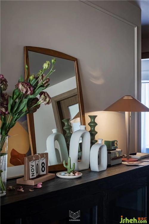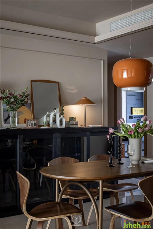 深色美国黄杨木床头柜与杨木斗柜,黑色铁椅腿,细金属拉手小细节元素与款式的呼应。