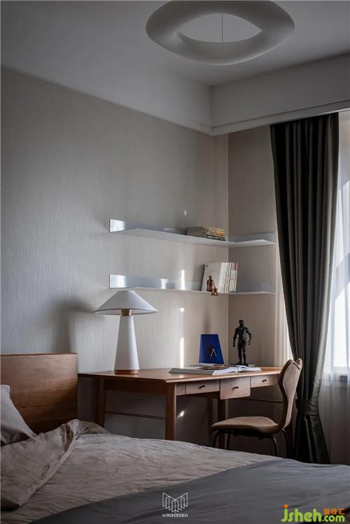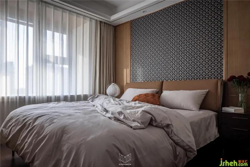 主卧沿用咖色系搭配灰色系床品,与保留的原有床头背景协调。南京装修设计局部改造背景软包,搭配英国Harlequinh LEONIDA玻璃珠颗粒黑色壁纸尽显摩登风味。
