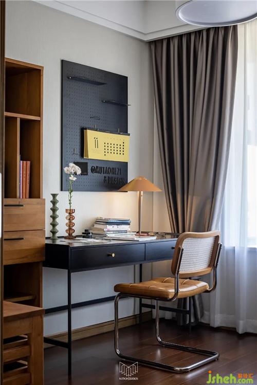 女主人书房同时兼具客房、小孩手工间、储藏间等诸多功能。深蓝色绒布可折叠沙发为客人提供服务。南京装修设计Mumo的A2收纳架以及Erika书柜为小孩书籍,画作提供收纳空间。