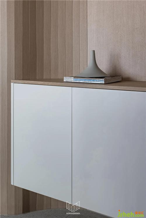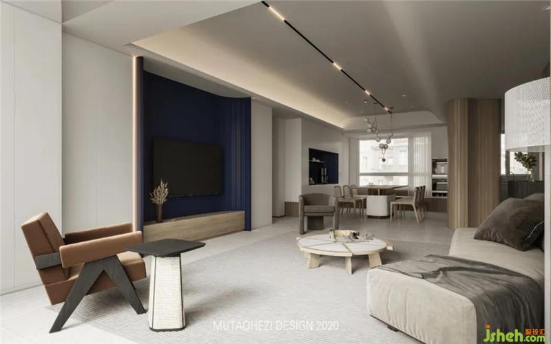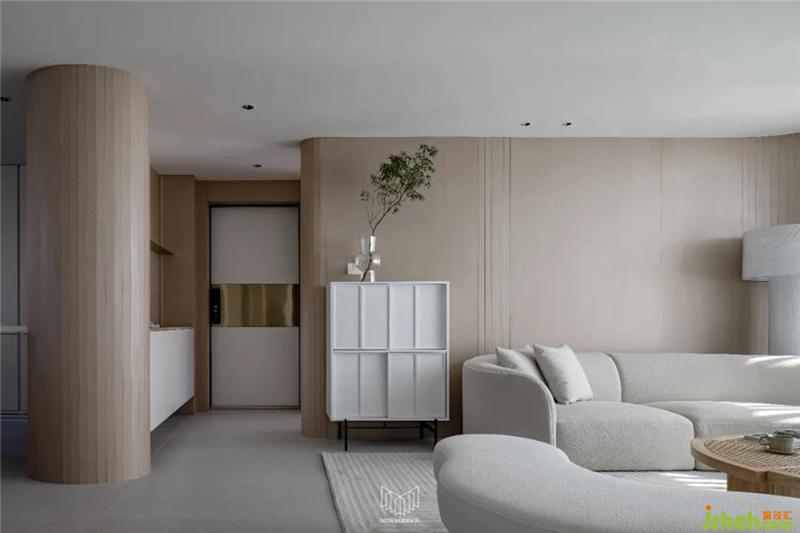门厅部分定制柜体,柜体运用流体造型,在保证储物量的同时,流体造型能够凸显空间的温暖氛围,并使视线平稳的过度到客、餐厅。