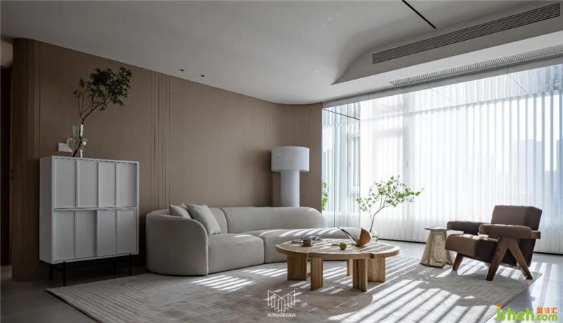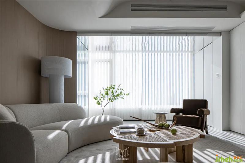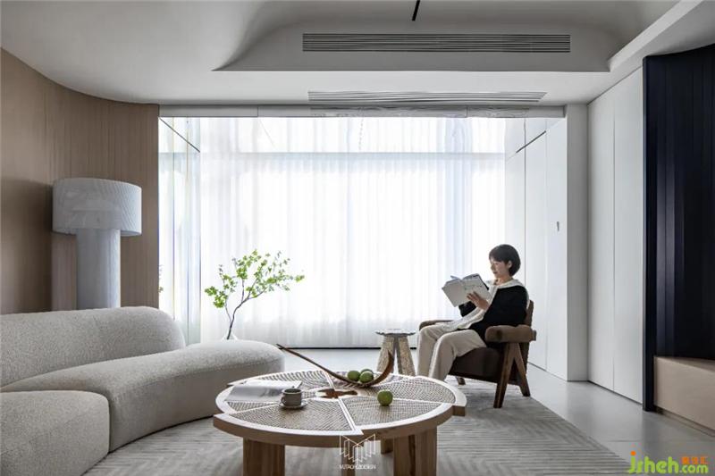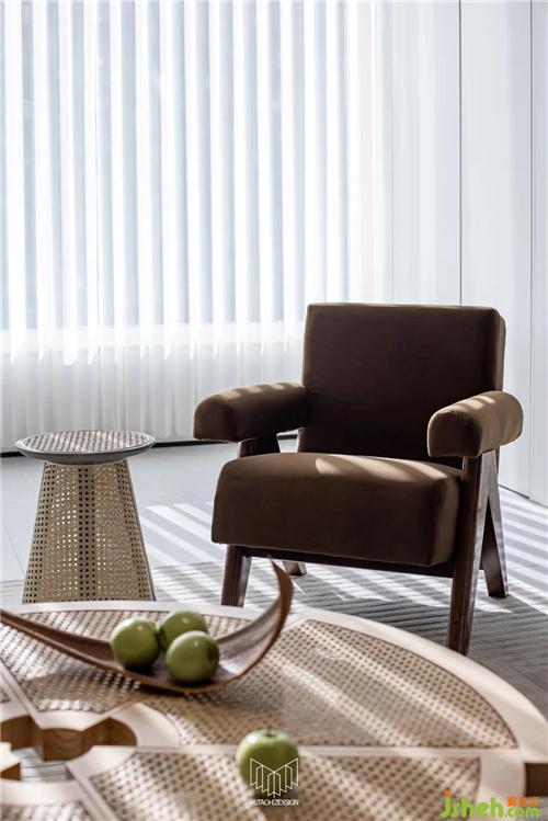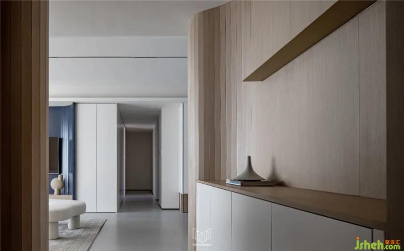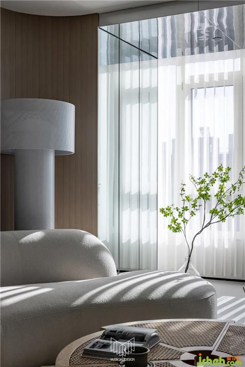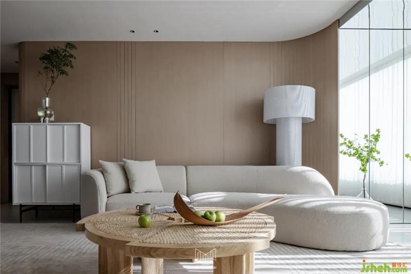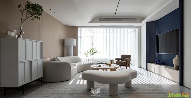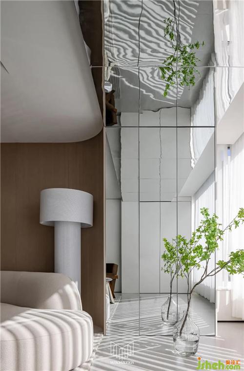 原阳台扩容至客厅,增加客厅面积,以羊羔绒、藤编元素家具点明自然主题,电视柜造型与鞋柜、岛台相呼应,定制镜面柜门和镜面不锈钢吊顶,让整体空间更加大气明亮。
