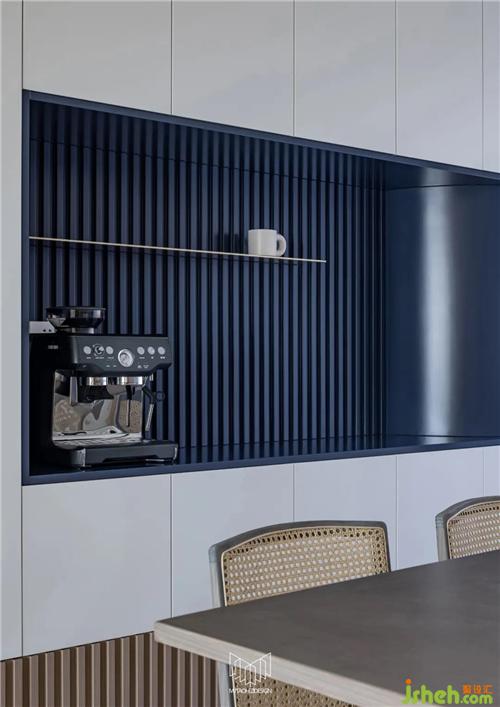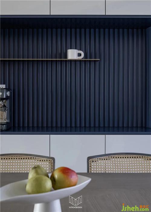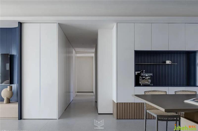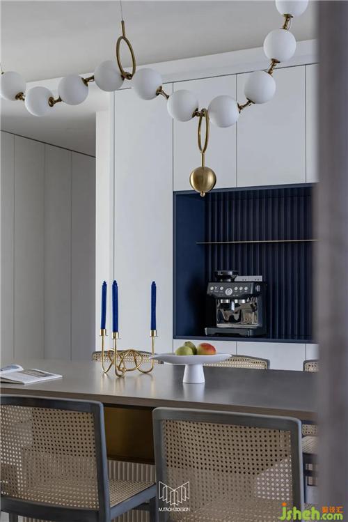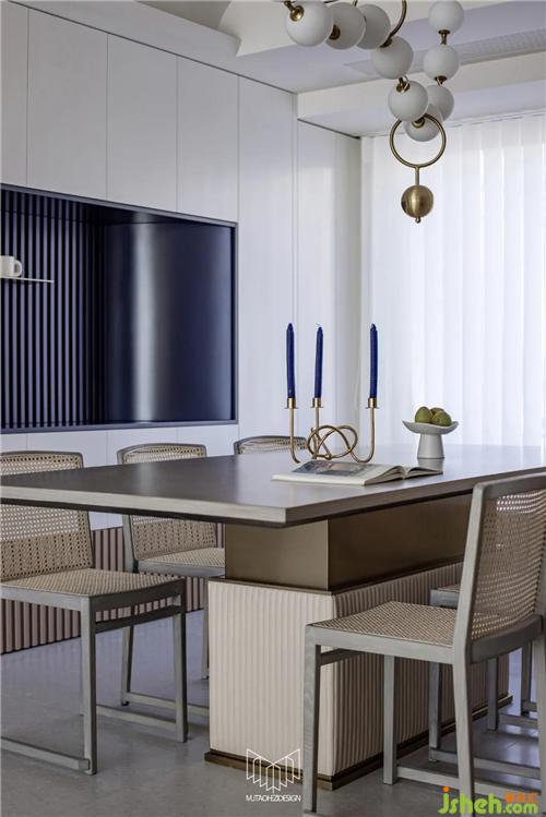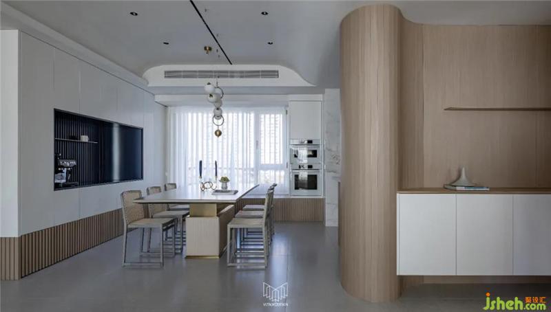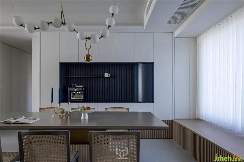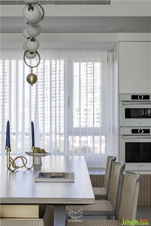 餐厅拆除局部墙体并定制岛台,使餐桌和厨房形成洄游动线,L型厨房定制内嵌式冰箱和蒸烤箱、洗碗机,南京装修设计在丰富功能的同时使厨房空间干净整洁,餐厅放置多人餐桌和定制餐边柜,可容纳多人聚餐,并进一步增加储物量。