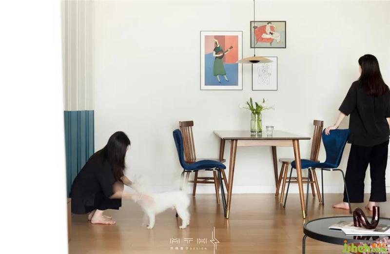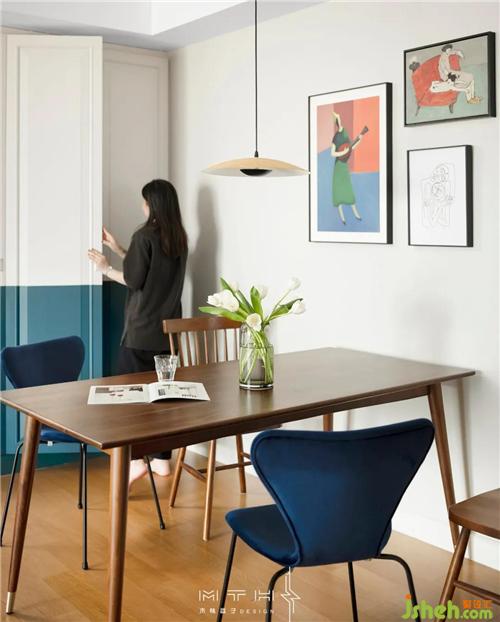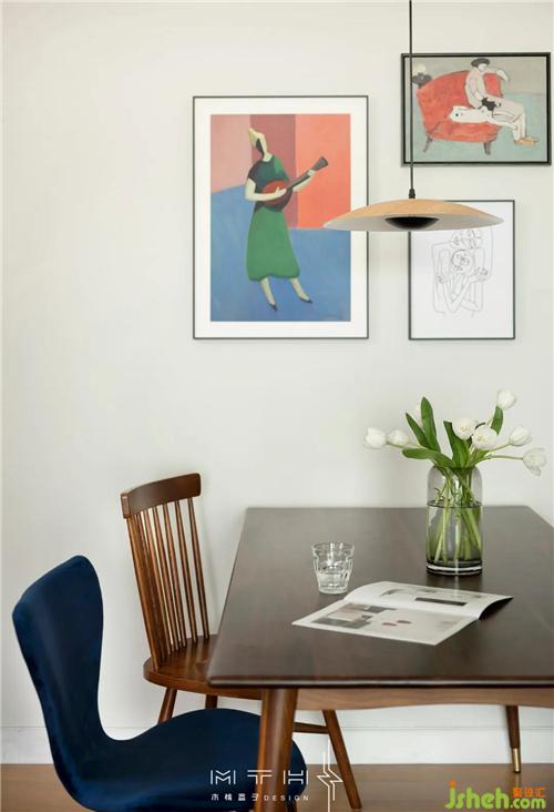 餐厅选用了两款不同材质和造型的餐椅,搭配胡桃木餐桌,既平衡又统一。南京装修设计墙面也选择色彩跳跃的组合装饰画,增添了空间的趣味性。