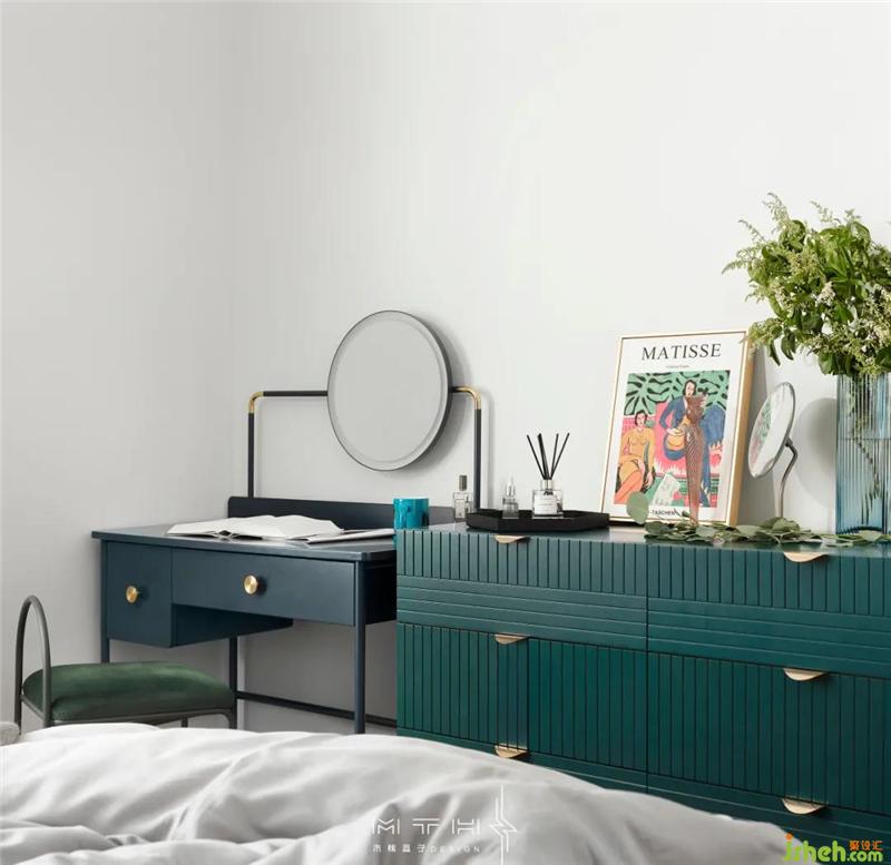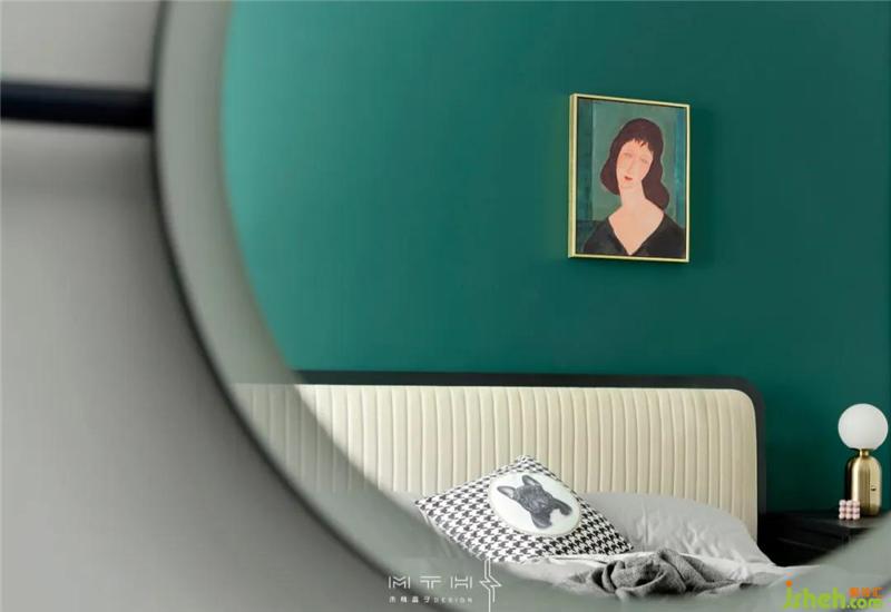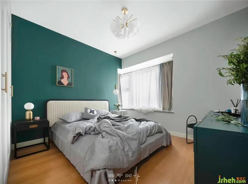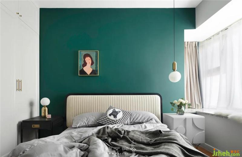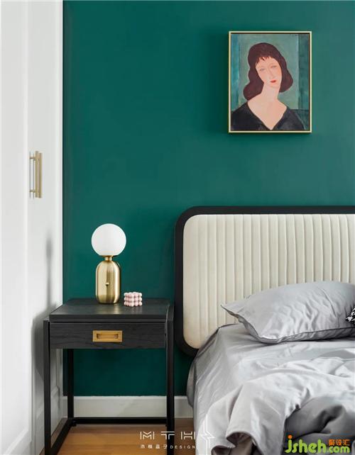 主卧室背景墙整面刷墨绿色乳胶漆,床头选择了一幅阿梅代奥·莫迪利亚尼的金色边框人物肖像画,画的背景同样也是蓝绿色,南京装修设计搭配在一起让墙面更具层次感。床头两侧台灯和吊线灯组合布光,也增加了空间的装饰效果。
