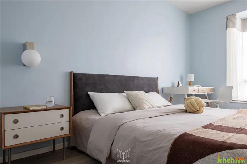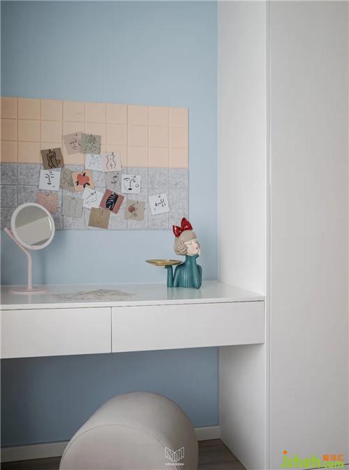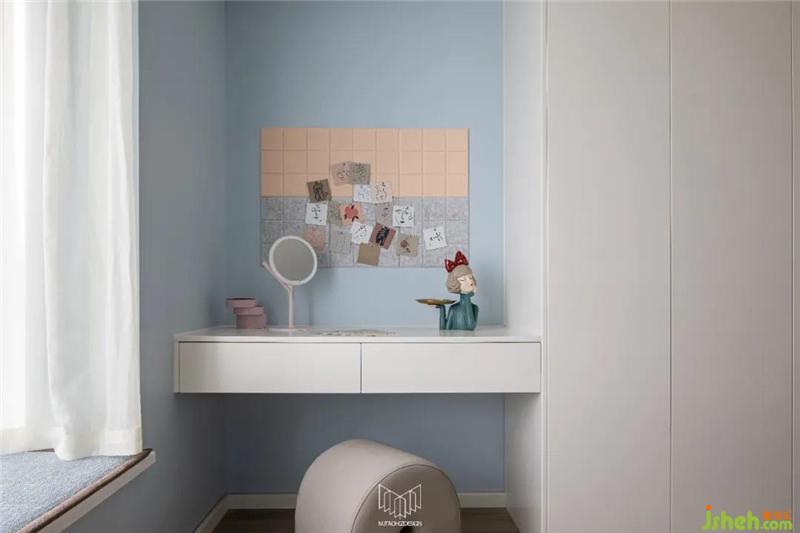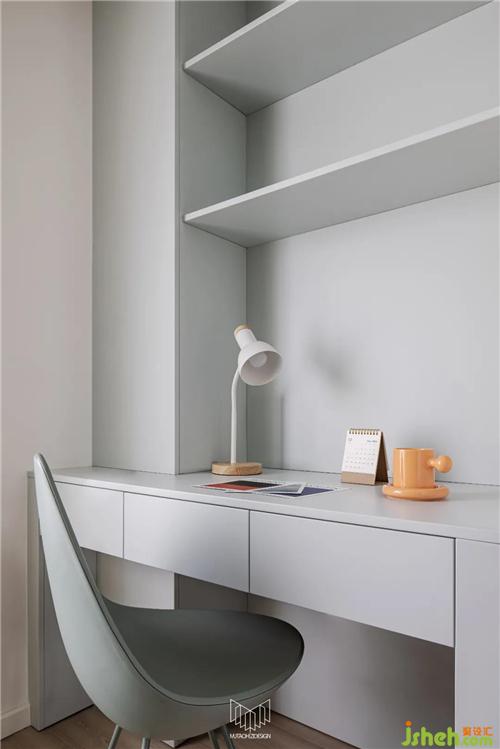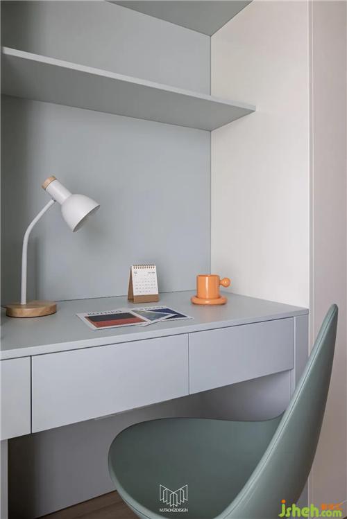 衣柜旁边布置了写字台,让宝宝安心学习,写字台上可放置书架和打印机。