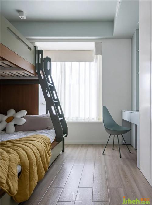北边卧室选择更加实用的上下床,借用一小块厨房空间布置衣柜。