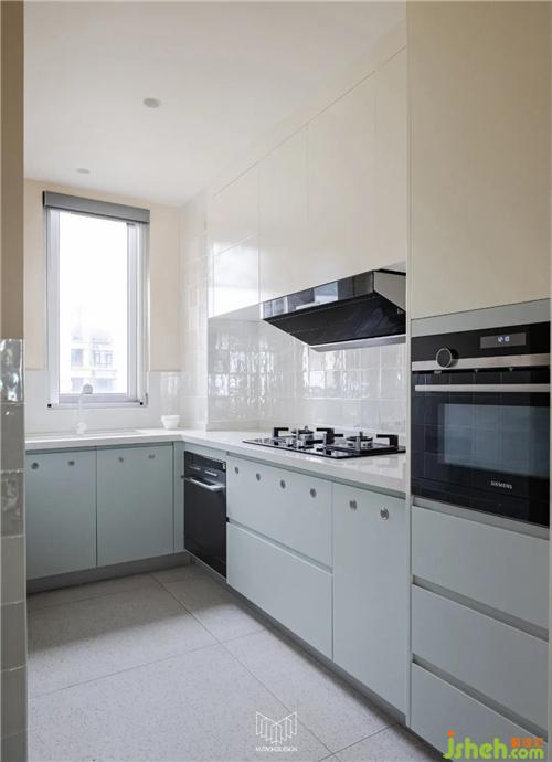 厨房大体保留原有布置,满足正常的功能,南京装修设计柜体门板及墙砖的颜色、材质选择让整体显得干净明亮。