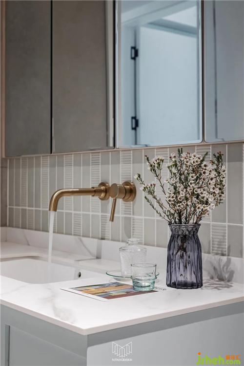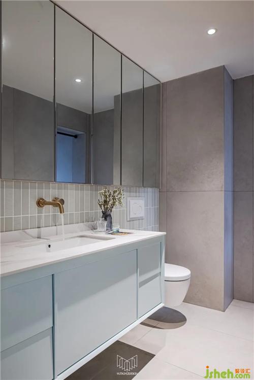 卫生间的布置根据需求的前提下尽量扩大,将洗脸台最大化。使用墙排马桶移位,在上方使用整体镜柜,增加储物空间。利用平台放置小浴缸和淋浴,用淋浴玻璃门将湿区和马桶隔开。