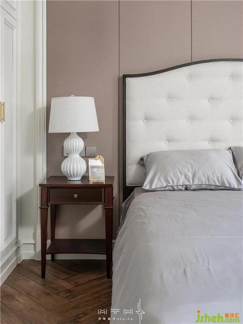 父母房延续客厅温润优雅的格调,没有繁琐和奢华,灰色的床品在中性色的环境下有着经历岁月沉淀后的安好与宁静。